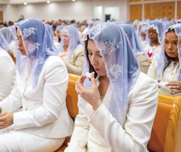 2025년 미국 뉴욕에서 열린 유월절 대성회에서 하나님의 교회 신자들이 성찬 예식에 참여하고 있다.325년 이후 1600여 년 동안 사라졌던 새 언약 유월절이 역사의 장막을 걷고 다시 등장한 건 하나님의 교회에서다. 1964년 한국에서 재건돼 복음을 전파하기 시작한 이 교회는 매해 성력 1월 14일 저녁(양력 3~4월경)에 새 언약 유월절을 지킨다. 지난해에도 175개국 7800여 지역에서 동시에 유월절 대성회를 거행했다. 세족(洗足) 예식에 이어 그리스도의 살과 피를 상징하는 떡과 포도주를 먹고 마시는 성찬 예식이 집전됐다. 《성경》 예언에 따라 새 언약을 회복하고 초대교회 방식 그대로 유월절을 지키는 곳은 전 세계에서 하나님의 교회가 유일하다.