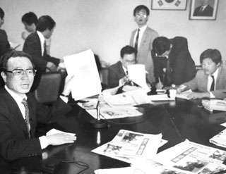| 1997³â 3¿ù ÇѺ¸Ã»¹®È¸ TV»ýÁß°è ÇÕÀǹ® ¼¸í¸¦ À§ÇØ È¸ÀÇÀåÀ¸·Î µé¾î¼´Â ¿©-¾ß Ãѹ«µé. Àڹηà ÀÌÁ¤¹«(¿ÞÂʳ¡) Ãѹ«¸¦ µû¶ó°¡´Â ½ÅÇѱ¹´ç ¹ÚÈñÅ Ãѹ«¸¦ ±¹¹ÎȸÀÇ ¹Ú»óõ Ãѹ«°¡ ¿ôÀ¸¸ç ¶°¹Ð°í ÀÖ´Ù. |