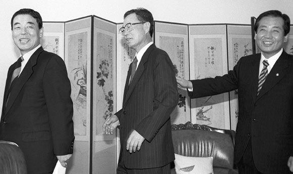 | 1990³â 1¿ù 22ÀÏ Ã»¿Í´ë¿¡¼ ±è¿µ»ï ¹ÎÁÖ´ç ÃÑÀç¿Í ±èÁ¾ÇÊ ½Å¹ÎÁÖ°øÈ´ç ÃÑÀç°¡ ÁöÄѺ¸´Â °¡¿îµ¥ 3´ç ÇÕ´çÀ» ¹ßÇ¥ÇÏ´Â ³ëÅÂ¿ì ´ëÅë·É. |
