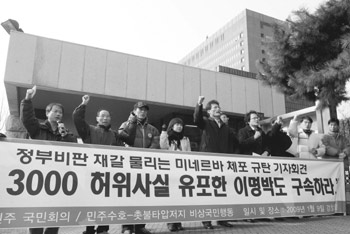 | ¡®¹Î»ý¹ÎÁÖ±¹¹ÎȸÀÇ¡¯¶ó´Â ½Ã¹Î´Üü ȸ¿øµéÀÌ ¼Ãʵ¿ °ËÂûû»ç ¾Õ¿¡¼ ¹Ì³×¸£¹Ù ¼®¹æÀ» ¿ä±¸ÇÏ´Â Áýȸ¸¦ ¿¾ú´Ù. |