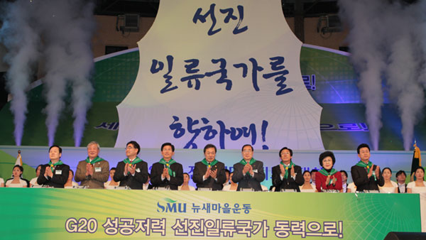 À̸í¹Ú(ì°Ù¥ÚÏ) Á¤ºÎ°¡ µé¾î¼¸é¼ ºñ·Î¼Ò ºÐÀ§±â°¡ ´Þ¶óÁ³´Ù. À̸í¹Ú ´ëÅë·ÉÀº Àü±¹ »õ¸¶À» ÁöµµÀÚ ´ëȸ¿¡µµ Âü¼®Çϰí, û¿Í´ë¿¡ Àü±¹ ȸÀå´ÜÀ» ÃÊÃ»ÇØ °Ý·ÁÇØ Áֱ⵵ Çß´Ù. ´öºÐ¿¡ »õ¸¶À» ÁöµµÀÚµéÀÌ ÈûÀ» ¾ò¾î Á¤ºÎÀÇ Á¤Ã¥°ú ¸ÆÀ» °°ÀÌÇÏ´Â ±¹¹Î¿îµ¿À¸·Î Áö¼Ó ¹ßÀü½Ã۱â·Î ¾à¼ÓÇß´Ù°í ÇÑ´Ù.