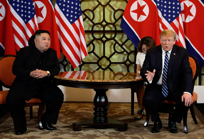 2019년 2월 28일 베트남 하노이에서 도널드 트럼프 미국 대통령(오른쪽)이 북한 김정은을 만났다. 사진=뉴시스/AP― 트럼프 대통령이 북한 김정은을 만날까요? 1기 정부에선 대북 협상에 대한 의지가 강했습니다.