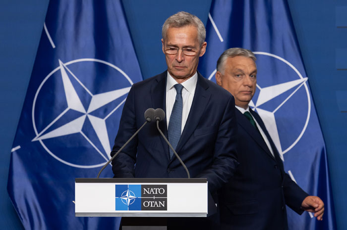 옌스 스톨텐베르그(앞쪽) 당시 북대서양조약기구(NATO) 사무총장이 2024년 6월 12일 헝가리 부다페스트에서 빅토르 오르반 헝가리 총리와 공동 기자회견에 참석하고 있다. 오르반 총리는 헝가리가 나토의 우크라이나 지원 활동에 참여하지 않을 것이라고 밝혔다. 사진=조선DB2023년 1월 홍규덕 교수는 전쟁 중인 우크라이나와 국경을 접한 헝가리에 대사로 부임했다. 헝가리에는 우크라이나에서 온 난민도 상당했다. 그는 한국이 이른바 위상에 맞는 기여를 하기 위해 국제이주기구(IOM), 유엔난민기구(UNHCR) 등 국제기구를 통해 인도적 기여를 50만 달러 이상씩 했다고 설명했다.