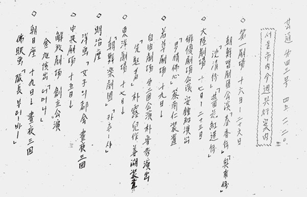 | ¡¶Àϰ£ ¿¹¼úÅë½Å¡· 1945³â 11¿ù 20ÀÏÀÚ. ´ç½Ã ¼¿ï½Ã³» ±ØÀå¿¡¼ °ø¿¬ ȤÀº »ó¿µ ÁßÀΠâ±Ø°ú ¿µÈ¸¦ ¼Ò°³Çϰí ÀÖ´Ù. |