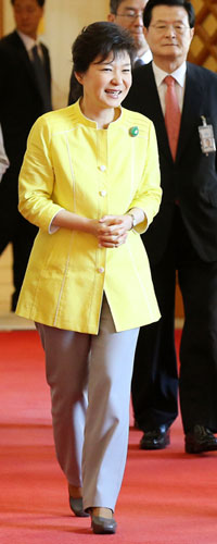 Áö³­ 2013³â 8¿ù 8ÀÏ °ú´Þ·çÆä ÆÈ·Î¸ÞÄÉ ÁÖÇÑ º¼¸®ºñ¾Æ ´ë»ç·ÎºÎÅÍ ½ÅÀÓÀåÀ» ¹Þ°í ¾Ç¼ö¸¦ ³ª´©´Â ¹Ú±ÙÇý ´ëÅë·É. ÆÈ·Î¸ÞÄÉ ´ë»ç´Â °ËÀº»ö Á¤Àå Â÷¸²Àε¥, ¹Ú±ÙÇý ´ëÅë·ÉÀº ºÐÈ«»ö »óÀÇ¿¡ º£ÀÌÁö»ö ¹ÙÁö Â÷¸²ÀÌ´Ù.