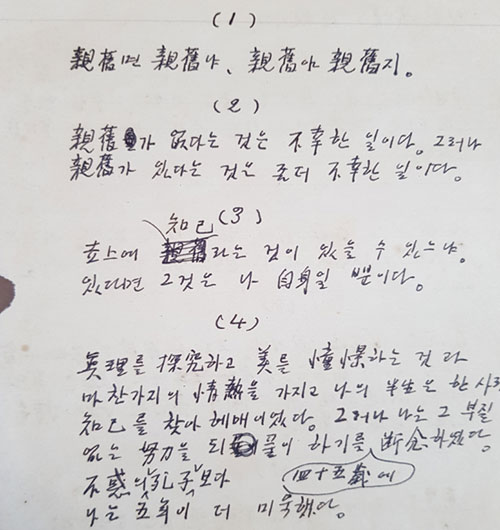 µÎ ¹øÂ° ¼öÇÊÀº Á¦¸ñÀÌ ¾ø´Ù. Èʳ¯ Áö»ó(òµß¾)¿¡ ¹ßÇ¥ÇÏ·Á ±ÛÀÇ ÀüüÀû °ñ°Ý¸¸ °£´ÜÈ÷ ¸Þ¸ðÇÑ °ÍÀ¸·Î ÃßÁ¤µÈ´Ù. ¡®Ä£±¸¸é Ä£±¸³Ä, Ä£±¸¾ß Ä£±¸Áö¡¯¿¡¼ ¡®ÀÚ½ÅÀ» »ç¶ûÇÒ ÁÙ ¾Æ´Â Àΰ£¸¸ÀÌ ÂüµÇ´Ù¡¯·Î À̾îÁö´Â ±ÛÀÇ ±¸¼º°ú È帧ÀÌ ¿¹»ç·ÓÁö ¾Ê´Ù. ±è³»¼º½Ä(ãÒ) ³í¸®Àû Ãß·ÐÀÌ ´À²¸Áø´Ù.
