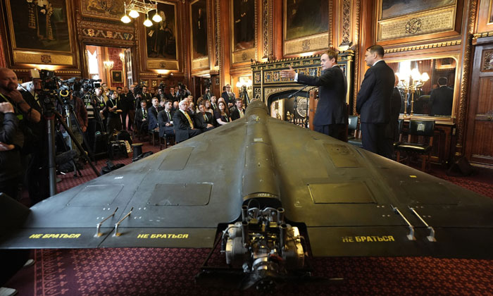 2025년 10월 14일 영국 런던 웨스트민스터 국회의사당에서 톰 투겐트하트 영국 하원의원(오른쪽 두 번째)과 라데크 시코르스키 폴란드 외무장관이 격추된 러시아군 샤헤드-136 공격 드론 앞에서 발언하고 있다. 사진=뉴시스/AP러시아는 샤헤드-136을 이란에서 도입해 자국에 자체 공장을 세워 ‘게란-2’라는 이름으로 생산해 우크라이나 전쟁에 활용하고 있다. 러시아는 제조 공정과 원자재 조달을 쉽게 하려고 초기 이란산 모델인 내부 벌집 구조(honeycomb) 대신 탄소섬유를 덧씌운 유리섬유 소재로 전환했다. 이에 따라 스텔스 성능은 일부 저하되지만, 동체 무게를 줄여 더 무거운 탄두를 장착할 수 있고 기동성도 개선됐다. 게란-2는 전자전에 대응하기 위해 안테나 7개 등을 장착한 전파 교란(재밍) 억제 체계가 추가됐다. 러시아는 타타르스탄 공화국에 대규모 샤헤드 제조 시설을 세웠는데 연간 2만5000대를 생산한다. 이곳에는 북한 노동자 1만2000명이 파견돼 있다.