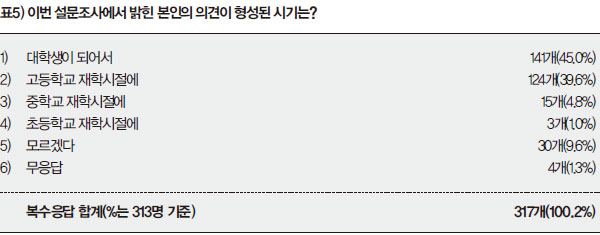 ÀÀ´äÀÚ 313¸íÀÌ Áߺ¹À¸·Î ÀÀ´äÇÑ °æ¿ì¸¦ ¸ðµÎ Æ÷ÇÔÇØ ÀÀ´äÀÇ Àüü ¼ýÀÚ´Â 317°³ÀÌ´Ù. ÀÌ °¡¿îµ¥ ¡®´ëÇлýÀÌ µÇ¾î¼¡¯¶ó´Â ÀÀ´äÀÌ 141°³Àε¥ À̸¦ 313¸í ±âÁØÀ¸·Î ºñÀ²À» ±¸Çϸé 45.0%´Ù. ¡®°íµîÇб³ ÀçÇнÃÀý¿¡¡¯¶ó´Â ÀÀ´äÀº 124¸íÀε¥ ¸¶Âù°¡Áö ¹æ¹ýÀ¸·Î ºñÀ²À» ±¸Çϸé 39.6%ÀÌ´Ù. µû¶ó¼ ´ëÇлýµéÀÇ Çö´ë»ç¿¡ ´ëÇÑ ÀνÄÀº 85% Á¤µµ°¡ ¡®°íµîÇлý ½ÃÀý¡¯ ȤÀº ¡®´ëÇÐ ÁøÇÐ ÈÄ¡¯¿¡ Çü¼ºµÇ¾úÀ½À» ¾Ë ¼ö ÀÖ´Ù. ±× ÀÌÀü ½Ã±â´Â º° ¿µÇâ·ÂÀÌ ¾ø´Ù.
