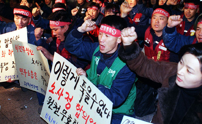 1997³âÀÇ °æÁ¦À§±â´Â 1990³â´ë ÃÊ¹Ý ±è¿µ»ï Á¤ºÎÀÇ Áý±Ç°ú ÇÔ²² ½ÃÀÛµÈ ¡®¹ÎÁÖ¡¯ ³ëµ¿¿îµ¿ÀÇ À§±â¸¦ ½ÉȽÃÄ×´Ù. 1987³âÀÇ ¡®³ëµ¿ÀÚ´ëÅõÀ ÀÌÈÄ ÇϳªÀÇ ÆÐÅÏÀ¸·Î ÀÚ¸® ÀâÀº ¡®¹ÎÁÖ¡¯ ³ëÁ¶ÀÇ ÀüÅõÀû ¿îµ¿¹æ½Ä°ú ±×¿¡ µû¸¥ Àӱݻó½Â ¹× °í¿ëº¸ÀåÀº ÀÌÁ¦ ´õ ÀÌ»ó Áö¼ÓµÉ ¼ö ¾ø¾ú´Ù. ºÒȲÀÇ ±×´ÃÀÌ ±â¾÷ÀÇ ±¸Á¶Á¶Á¤À» ÇÇÇÒ ¼ö ¾ø´Â ÀÏ·Î ¸¸µé¾ú±â ¶§¹®ÀÌ´Ù. ¶ÇÇÑ ±¹°¡´Â ºÎµµ(default)¸¦ ¸·±â À§ÇØ µé¿©¿Â ÇØ¿ÜÀÚº»ÀÇ ¿ä±¸¸¦ ¿Ü¸éÇÒ ¼ö ¾ø¾î °³ÇõÀ̶ó´Â À̸§À¸·Î ³ëµ¿ÀÇ À¯¿¬È¸¦ ¹Ð¾îºÙ¿´´Ù.