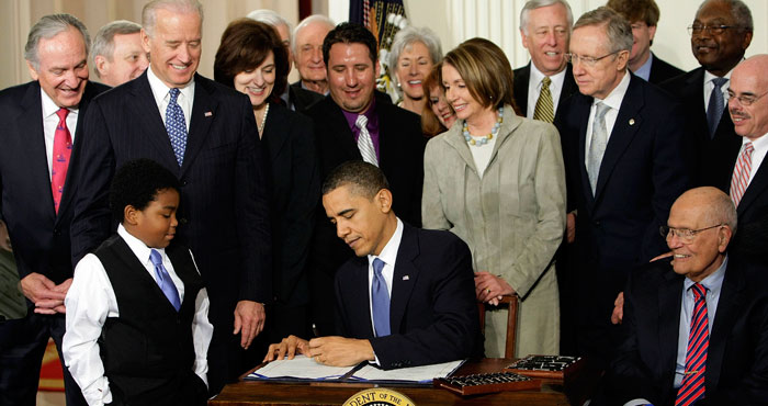 ¿À¹Ù¸¶ ´ëÅë·ÉÀº 2010³â 3¿ù 23ÀÏ ¹Ì±¹Çü °ø°øÀǷẸÇèÀÎ ¿À¹Ù¸¶ Äɾ ¼¸íÇß´Ù. »çÁø=AP/´º½Ã½º¹Ì±¹ ¿À¹Ù¸¶ ÇàÁ¤ºÎ´Â 2010³â ¡®È¯ÀÚº¸È£ ¹× ÀûÁ¤Áø·á¹ý¡¯ÀÎ ¼ÒÀ§ ¿À¹Ù¸¶ Äɾî(ACA)¸¦ µµÀÔÇß´Ù. ¿À¹Ù¸¶ ÄɾîÀÇ ÇÙ½ÉÀº ¡®°Á¦ °¡ÀÔ(mandate)¡¯°ú ¡®º¸Á¶±Ý Áö¿ø(subsidy)¡¯ÀÌ´Ù. º¸Çè °¡ÀÔÀ» Àǹ«ÈÇÏ¿© °Ç°ÇÑ »ç¶÷µéµµ º¸Çè·á¸¦ ³»°Ô ÇÔÀ¸·Î½á ÃæºÐÇÑ ¾çÀÇ Àç¿øÀ» ¸¶·Ã, À̸¦ ÅëÇØ Àú¼ÒµæÃþÀÇ º¸Çè·á¸¦ °£Á¢ÀûÀ¸·Î Áö¿øÇÏ´Â ¹æ½ÄÀÌ´Ù. ¿ì¸®³ª¶ó¿Í °°ÀÌ °Á¦·Î °Ç°º¸Çè·á¸¦ °È¾î°¡´Â ¹æ½ÄÀÌ ¾Æ´Ï¶ó, ¾Æ¹«·± º¸Çè¿¡µµ °¡ÀÔÇÏÁö ¾ÊÀ¸¸é ¹ú±ÝÀ» ºÎ°úÇÏ´Â °£Á¢ÀûÀÎ ¹æ½ÄÀ» ÅÃÇß´Ù.