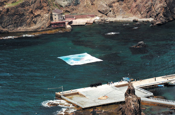 | Áö³ 5¿ù 27ÀÏ ¿ÀÈÄ µ¶µµÀÇ µ¿µµ¿Í ¼µµ »çÀÌ ¾Õ¹Ù´Ù¿¡ ´ëÇü űرⰡ ¶¹´Ù. °¡·Î 30m¡¿¼¼·Î 20m Å©±âÀÇ ÀÌ Å±رâ´Â ¿ï¸ªµµ Áֹΰú µ¶µµ ¹æ¹®°´ µî 6000¸íÀÌ Á÷Á¢ À¯¼º ¾ÆÅ©¸± ¹°°¨À» ÇÚµåÇÁ¸°ÆÃÇØ Á¦ÀÛÇß´Ù. (»çÁø=Áö¿À¿£ÅÍÅ×ÀÎ¸ÕÆ® Á¦°ø) |