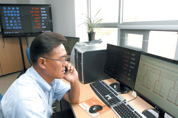 | LG ž籤 ¹ßÀü¼Ò »óȲ½Ç. ½Ã½Ã°¢°¢ ¹ßÀüµÈ ´©Àû Àü·Â·®°ú À̸¦ ÁÙ¿© ÁÖ´Â ÀÌ»êÈź¼Ò ¹èÃâ·®À» ȯ»êÇØ¼ º¸¿©ÁØ´Ù. |