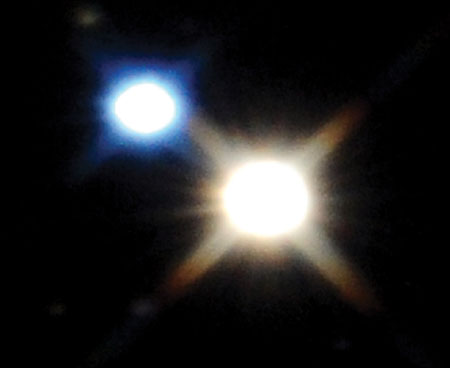 | ¾Ëºñ·¹¿À(Albireo). ¹éÁ¶ÀÚ¸®ÀÇ ¸Ó¸®¿¡ ÇØ´çÇÏ´Â º°ÀÌ´Ù. ¸Á¿ø°æÀ» ÅëÇØ º¸¸é µÎ °³ÀÇ º°ÀÌ ¸¶ÁÖ µµ´Â ÀÌÁß¼ºÀÌ´Ù. ¾Ëºñ·¹¿À´Â µÎ º°ÀÇ »öÀÌ ´Þ¶ó ¹ãÇϴÿ¡¼ ¾Æ¸§´Ù¿î õü Áß Çϳª·Î ²ÅÈù´Ù. |