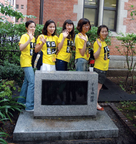 | µµÁö»þ(ÔÒò¤Þä)´ëÇÐÀ» ¹æ¹®ÇÑ Ã¼Çè´Ü ¿©ÇлýµéÀÌ ëÅÔÔñº(À±µ¿ÁÖ) ½ÃÀÎÀÇ ½Ãºñ ¾Õ¿¡¼ Æ÷Á ÃëÇϰí ÀÖ´Ù. |