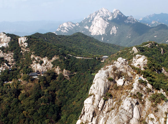 - º¸ÇöºÀ ÂÊ¿¡¼ ºÏÀ¸·Î ¹Ù¶óº» ºÏÇÑ»ê. ¿ÞÂÊÀÌ ¹®¼öºÀÀÌ°í ±× ¾Õ¿¡ ³õÀÎ »çÂûÀÌ ¹®¼ö»ç´Ù. ¹®¼öºÀ°ú º¸ÇöºÀÀ» ÀÕ´Â ´É¼±¿¡ ºÏÇѻ꼺ÀÇ ´ë³²¹®ÀÌ ÀÖ´Ù. ´É¼± µÚ·Î Àú ¸Ö¸® ¹é¿îºÀ°ú ÀμöºÀ, ¸¸°æ´ë°¡ º¸ÀδÙ.