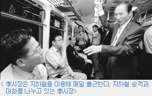 李明博 시장 일행은 동대문역에서 1호선으로 갈아탔다. 1호선 전철을 타자 李시장을 알아본 시민들이 자리를 비켜 주었다. 李시장은 『고맙다』면서도 자리에 앉지는 않았다. 李시장보다 지하철 승객이 먼저 말을 걸어왔다.
