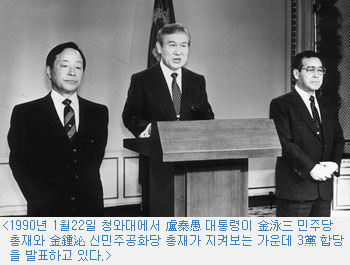 1987년 대통령 직선제 改憲 직후 실시된 大選에서 민정당 盧泰愚 후보는 兩金(김영삼-김대중)의 大選후보 단일화 실패 덕으로 정권을 획득하게 된다. 그러나 與小野大(여소야대) 정국에서 盧泰愚 당시 대통령은 법률안이나 人事에서 야당 연합에 발목이 잡혀, 국정운영에 심각한 어려움을 겪었다. 결국 盧泰愚 대통령은 1990년 1월 당시 민주당 金泳三 총재, 공화당 金鍾泌 총재와 손을 잡고 3黨 합당을 전격 단행했다. 金大中 총재의 평민당을 제외한 거대여당이 탄생한 것이다. 이들 3黨을 하나로 연결한 고리가 바로 내각제였으나 金泳三씨의 大權 드라이브에 밀려 물거품이 되었다.
