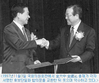 내각제를 고리로 한 정계개편은 1997년 大選에서도 이뤄졌다. 1997년 11월3일 국민회의 金大中 총재와 자민련 金鍾泌 총재는 정권교체를 위해 大選후보를 단일화한다는 이른바 DJP 연합을 만들어냈다. 두 총재는 공동정부를 구성하고 내각제를 추진한다는 데 합의, 이를 大選 공약사항으로 내걸었다. 내각제 改憲은 국민들과의 약속이었다.