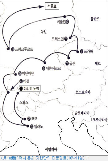 이번 여행의 경로는 스위스의 취리히 공항에 내린 다음날 육로로 이탈리아 밀라노 근교의 코모로 이동하여 그 뒤 독일 남부의 바덴바덴, 戰犯 재판으로 유명한 뉘른베르크, 체코의 프라하, 舊동독지역의 드레스덴, 베를린 등지를 여행하고 프랑크푸르트를 통해 인천공항으로 돌아오는 것으로 되어 있습니다.