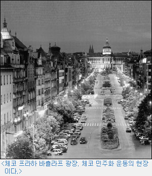 1989년 11월17일 공산당 지배下의 체코 정부는 민주화 시위를 벌이는 학생들을 구타했습니다. 여기에 항의하는 시위가 바츨라프 광장에서 연일 계속되었습니다. 한때는 70만 명의 시위대가 이 광장을 메웠습니다. 1989년 11월24일 이 광장거리가 내려다보이는 언덕 위 국립박물관 발코니에 알렉산더 두브체크(1968년 민주화 운동을 주도했던 공산당 서기장)와 바클레브 하벨(뒤에 대통령)이 나타나 공산당 정권 타도를 선언했습니다. 공산정권은 즉시 정부를 인계하고 조용히 역사의 뒤안길로 사라졌습니다.