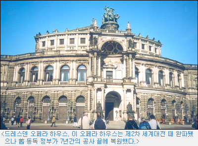 우리 月刊朝鮮 여행단은 9월26일 오전 8시30분에 프라하를 출발하여 엘츠비르게 산맥을 넘어 3시간 만에 東獨 지역의 드레스덴에 도착했습니다. 드레스덴이 州都로 있는 작센(영어로는 Saxony)州는 1871년 독일 통일제국이 탄생하기 전엔 독립王國이었습니다. 인접한 프로이센(영어로는 프러시아)과 함께 독일민족의 패권을 다툰 적도 있습니다.