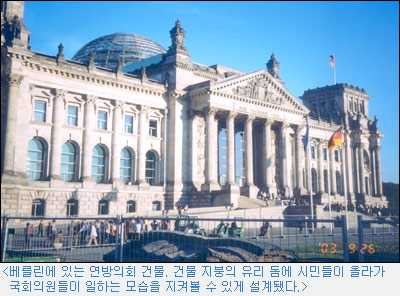 내각제인 독일의 정치권력이 나오는 本山인 거대한 연방의회 건물은 최근에 새로 단장하여 인기가 있습니다. 히틀러 시대인 1933년 이 건물이 불탔는데 히틀러는 이 화재를 정치적으로 이용하여 반대파를 탄압하고 독재권을 잡았습니다. 건물의 정면에는 「Dem Deutschen Volke(독일민족을 위하여)」라는 글이 있습니다. 이 건물의 가운데에 있는 돔은 유리 半球(반구)로 투명합니다. 이 유리돔에는 나선형으로 통로를 만들어 사람들이 등산하듯이 올라갈 수 있습니다.
