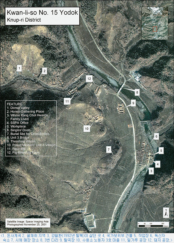 국제적인 학살조사 전문가 데이비드 호크(미국內 북한 인권위원회 소속)씨가 지난 10월22일 발표한 「숨겨진 정치범 수용소」에 실린 북한의 제15호 관리소 요덕 관리소의 인공위성 사진. 이곳에서는 『3代에 걸쳐 씨를 말리라』고 한 金日成의 교시에 따라 수용자들에 대한 공개 처형·고문과 학대가 일상적으로 자행되고 있다