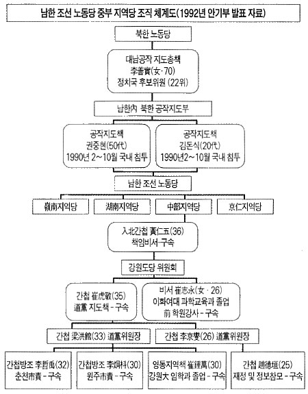 안기부는 북한이 민중당에 침투시킨 간첩 金洛中·孫炳善 일당 여섯 명과 「남한 조선 노동당」 중부지역당 조직원 400여 명 중 총책 黃仁五 등 124명을 검거, 이 중 68명을 간첩·反국가단체 구성 혐의 등으로 구속, 송치하고 잔당을 추적 중이다. 同수사과정에서 권총, 수류탄 등 각종 무기류와 무전기, 亂數表(난수표) 및 공작금 100만 달러 등 총 149종 2399점에 달하는 공작금품을 압수했다>