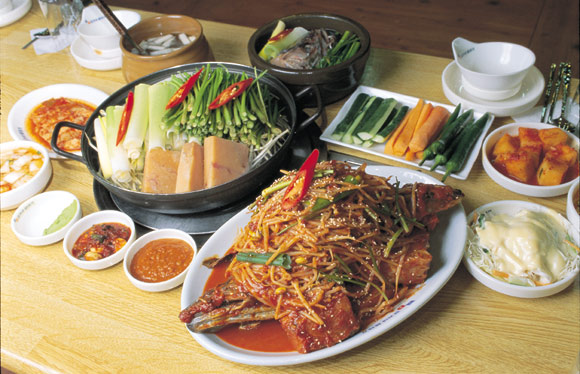 - 대구머리 뽈찜과 뽈국. 탕이나 찜의 개운한 맛을 나게 하는 콩나물은 직접 재배한 것으로 대가리를 따서 쓴다.