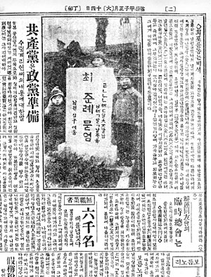 | 崔遵禮의 묘비 건립사실을 보도한 1924년 2월28일자「東亞日報」지면. 묘비 뒤의 중절모 쓴 사람이 金九이고, 그 옆이 곽씨부인, 묘비 오른쪽이 장남 仁, 왼쪽이 둘째 信이다. |