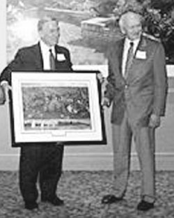 | 지난 가을 이사회에서「3000만 달러 기금 모금」을 결정한 후 학교발전 청사진을 든 바이어 교장과 크레인 이사장. |