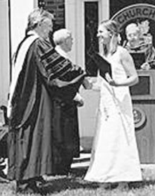 | 졸업생들과 악수를 나누는 교장과 이사장. |