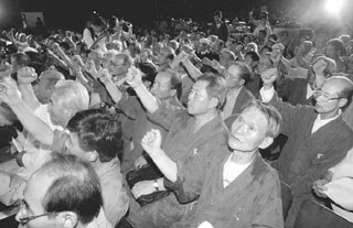 | 2000년 8월27일 연세大 대강당에서 열린 비전향 장기수 환송회에 참가한 장기수들이「연방통일조국 앞당기자」는 구호를 외치고 있다. |