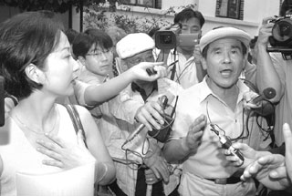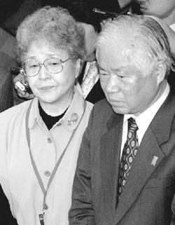 | 일본 정부로부터 북한에 피랍된 일본인 요코다 메구미의 DNA 분석 결과를 공식 통보 받은 부모 요코다 시게루와 요코다 사키에 부부가 지난 4월11일 도쿄에서 기자들에게 둘러싸여 회견하고 있다.<마이니치신문 제공> |