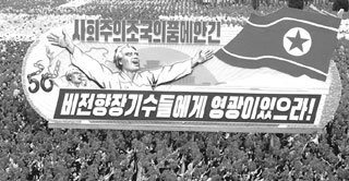 | 2000년 10월10일 북한 평양 김일성광장에서 열린 노동당 창건 기념행사에 등장한 비전향 장기수를 환영하는 대형그림. |