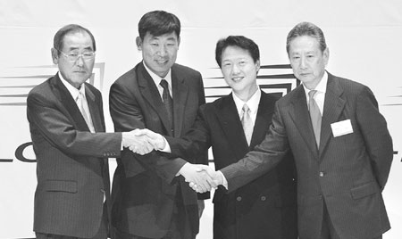 | LCD ÅõÀÚ¿¡ ¼ÒȦÇß´ø ¼Ò´Ï´Â ß²àø°ú ÇÕÀÛ¹ýÀÎ S-LCD¸¦ ¼³¸³ÇØ¾ß Çß´Ù. 2004³â ȸ»ç Ãâ¹ü½Ä¿¡ Âü¼®ÇÑ À±Á¾¿ë »ï¼ºÀüÀÚ ºÎȸÀå, Àå¿ø±â CEO, ³ªÄ«ÀÚ¿Í °ÔÀÌÁö CEO, À̵¥ÀÌ ³ëºÎÀ¯Å° ¼Ò´Ï ȸÀå(¿ÞÂʺÎÅÍ). |