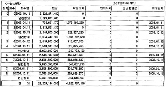 ±èÇØ½Ã¿Ü¹ö½ºÅ͹̳ΠºÎÁö ¾àÁ¤±ÇÀ» Ë©¾¾·ÎºÎÅÍ ³Ñ°Ü ¹ÞÀº ÚÓæÐó ȸÀå µîÀº 1ȸÂ÷ ¾àÁ¤±Ý ³³ÀÔÀÏÀÎ 2002³â 10¿ù11ÀÏ ¾àÁ¤¿ø±Ý 28¾ï2987¸¸1400¿øÀ» Çѱ¹ÅäÁö°ø»ç¿¡ ÀÔ±ÝÇß´Ù. ÚÓæÐó ȸÀå µîÀº ÇöÀç±îÁö ¸ðµÎ 8ȸ(2006³â 10¿ù11ÀϱîÁö)¿¡ °ÉÃÄ ¾àÁ¤¿ø±Ý 232¾ï511¸¸4000¿ø°ú ¾àÁ¤ÀÌÀÚ 56¾ï3202¸¸2210¿ø µî ¸ðµÎ 288¾ï3713¸¸6210¿øÀ» ³³ºÎÇß´Ù. ÚÓȸÀåÀº ÀÌ ¾àÁ¤±ÝÀ» 4³â¿©¿¡ °ÉÃÄ Çѱ¹ÅäÁö°ø»ç¿¡ ³³ºÎÇØ ¿À¸é¼ ´Ü ÇÑ Â÷·Êµµ ³³ºÎ±âÀÏÀ» ¾î±âÁö ¾ÊÀº °ÍÀ¸·Î È®ÀεƴÙ(Çѱ¹ÅäÁö°ø»çÀÇ ºÎÁö ¸Å°¢ ÀÚ·á ÂüÁ¶).