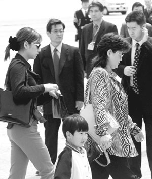 | 위조여권으로 일본에 입국하려던 金正日의 장남 金正男과 함께 체포돼 중국으로 추방된 두 여인과 네 살짜리 아이가 2001년 5월4일 일본 나리타 공항에서 중국 베이징行 ANA 905편에 탑승하기 위해 걸어가고 있다. |