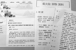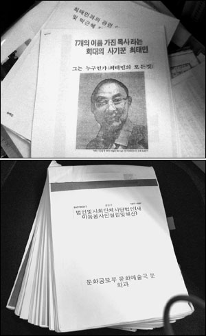 | 1990년경 육영재단 내부 문제가 발생했을 당시 최태민씨의 반대파들이 작성해 유포한 자료(사진 위)와 1980년 문화공보부가 조사한「새마음 봉사단」비리관련 문건. |