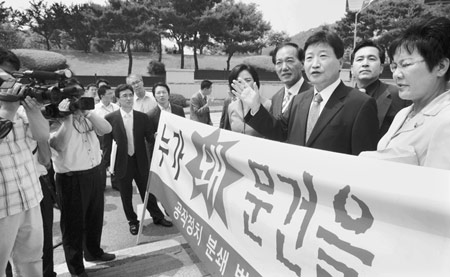 | 한나라당 공작정치 저지 투쟁위원회 안상수 위원장(오른쪽 두 번째)과 박계동, 심재철 의원 등이 지난 7월6일 오전 국정원을 항의 방문, 기자회견을 갖고 있다. |