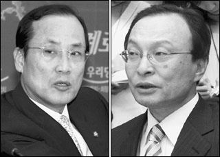 | 『한나라당 大選 후보를 한 방에 날릴 수 있다』고 장담한 장영달 열린당 원내대표(왼쪽)와 이해찬 前 총리. |