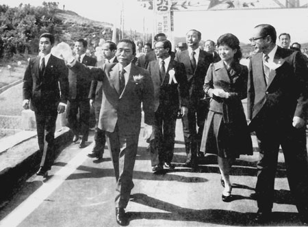 | 1975년 10월14일 영동-동해고속도로 개통 테이프를 끊은 직후 환영하는 주민들에게 손을 흔들며 답례하는 박정희 대통령. |