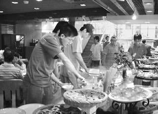 | 지난 9월22일 아침 아나 호텔 1층 식당에서 우지원과 선수들이 음식을 고르고 있다. |