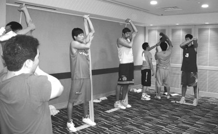 모비스의 손용석 트레이너가 2인 1조로 짝을 지어 지도를 했다. 손 트레이너는 『테라밴드가 자동차 타이어 바퀴처럼 질긴 고무로 만들어진 것이어서 만만하게 보면 큰 코 다친다』고 했다.