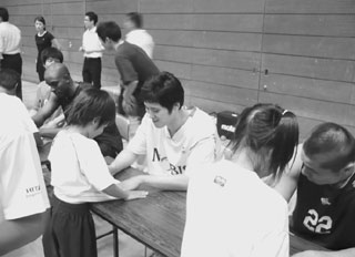 | 모비스 선수단이 지난 9월18일 아마 가사키체육관에서 오사카 에베사팀과 연습경기를 한 후 팬 사인회를 하고 있다. |