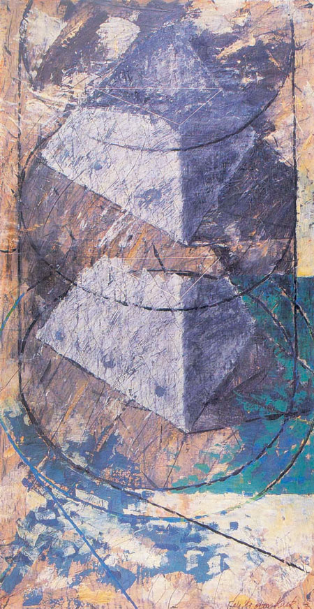 『1989년부터 「氣」 시리즈를 본격적으로 했지만 「呪文」과 「도자기」 시리즈를 하면서 자연스럽게 나온 것입니다. 큐빅 속의 氣가 밖으로 튀어나오는 것은 남성의 氣가 밖으로 튀어나오는 형태입니다』