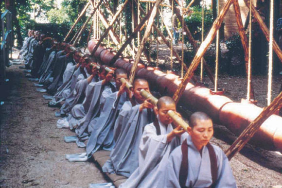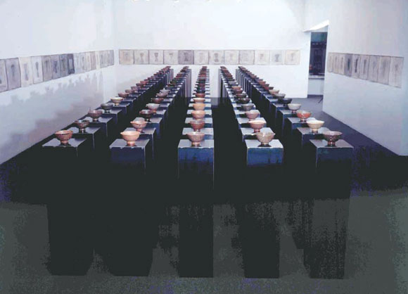 | 1996년 베니스 비엔날레에 출품한「겁/소리」. 설치작품과 스님들이 어울린 이 작품에 대해 큰 반향이 일었다고 한다. |