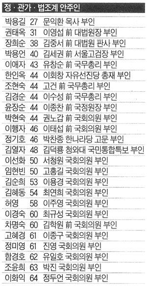 | 경기여고 44회 동기생들의 월례모임이 1997년, 서울 대학로의 한 음식점에서 열렸다. 왼쪽부터 장재식 前 국회의원의 부인 최우숙씨, 이수성 前 국무총리 부인 김경순, 이회창 한나라당 총재 부인 한인옥, 이종찬 前 국정원장 부인 윤장순, 권노갑 前 민주당 고문 부인 박현숙. |