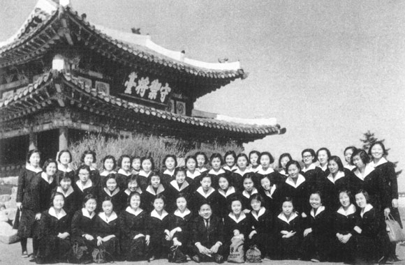 | 남한산성 수어장대 앞에서 기념사진 촬영한 경기여고생들(1967년). |