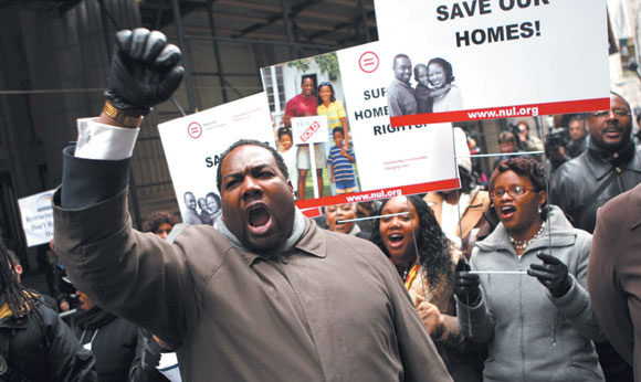 - 주택을 차압 당한 소비자들이 뉴욕 월스트리트에서 금융회사들의 조치를 촉구하는 시위를 벌이고 있다. 시위대 중 한 남성이 “우리의 집을 살려 달라”는 피켓을 들고 있다.